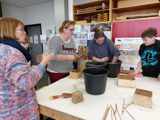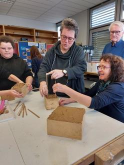 Los ging es bei der Fortbildung, an der insgesamt neun Erzieherinnen und Erzieher teilnahmen, ganz praktisch. Die erfahrenen Schülerinnen und Schüler der Imker-AG an der GSO zeigten in ihrem Werkraum, wie man beim Bau einer solchen Nisthilfe herangeht: Lehm, wie er z.B. auch beim Bau von Fachwerkhäusern verwendet wird, wird in Formen gefüllt und mit Löchern in geeigneter Größe versehen, in Holzscheite wird seitlich gebohrt oder, wer es ganz einfach möchte, kann hohle Äste und Stängel in eine Form schichten oder mit Draht zu einem Bündel packen. Kombiniert kann man all diese Varianten in einem Modulsystem zu einer Nistwand zusammenstellen. Fast alle Arbeitsschritte sind auch schon für die Kleinsten ein spaßiges Unternehmen.