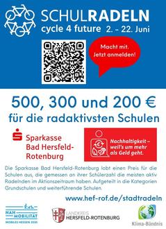 Wie auch schon im Jahr 2023 werden die radaktivsten Grundschulen und weiterführenden Schulen im Landkreis ausgezeichnet. Die Sparkasse Hersfeld-Rotenburg lobt einen Preis (Platz 1: 500 Euro, Platz 2: 300 Euro, Platz 3: 200 Euro) für die Schulen aus, die gemessen an der ihrer Schülerzahl die meisten aktiv Radelnden im Aktionszeitraum haben.
