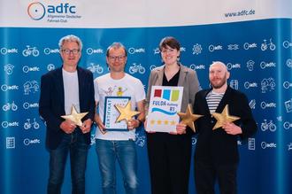 Freuen sich über die Vier-Sterne-Zertifizierung des Fuldaradwegs (von links): Christian Tänzler (ADFC-Bundesvorstand Tourismus), Jörg Peters (Tourismusbeauftragter des Landkreises Hersfeld-Rotenburg & Qualitätsbeauftragter Fuldaradweg), Lena Pfaar (GrimmHeimat Nordhessen), Michael Maier (Tourismusreferent ADFC Geschäftsstelle Berlin).