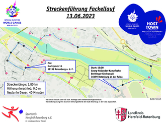 Am Dienstag, 13. Juni ab 15 Uhr steht der Höhepunkt des viertägigen Besuchs der Kirgisen an. Genau wie in allen rund 200 Host Towns bundesweit findet in Rotenburg, am von den Special Olympics World Games initiierten Inklusionstag, ein Fackellauf statt. Los geht es um 15 Uhr an der George-Hollender-Kampfbahn im Breitinger Kirchweg. Knapp zwei Kilometer geht es dann gemeinsam zum Marktplatz. Der Weg führt unter anderem entlang des Landratsamtes in Rotenburg und über die Alte Fuldabrücke.