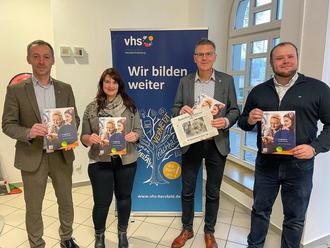 Fabian Göbel (Leiter der VHS Hersfeld-Rotenburg), Mitarbeiterin Jaquelin Fischer, Erster Kreisbeigeordneter Dirk Noll und Mitarbeiter Thilo Weimar (von links) mit dem neuen VHS-Programm. Foto: Landkreis Hersfeld-Rotenburg