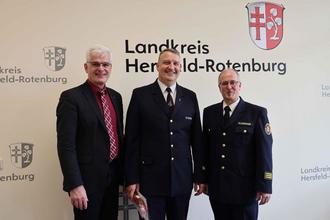 Landrat Torsten Warnecke (links) und Kreisbrandinspektor Marco Kauffunger (rechts) freuen sich, dass Kreisbrandmeister Holger Möller (mittig) weiterhin die Feuerwehren der Gemeinden Alheim, Ludwigsau sowie der Stadt Rotenburg unterstützt.