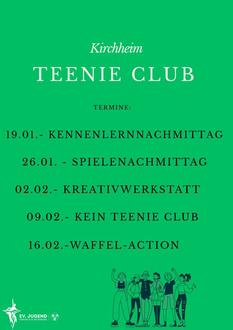 Ab dem 19. Januar um 15:30 Uhr startet der Teenie Club im Jugendzentrum Kirchheim. Zum Auftakt sind alle Teenies herzlich zu einem Kennenlern-Nachmittag eingeladen. Dabei können sie sich gegenseitig kennenlernen sowie das Jugendzentrum und seine Angebote entdecken.
