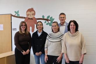 Freuen sich über den Erfolg des Projekts: Julie Dettmann (Lehrbeauftragte), Schulleiterin Ute Wagner-Scheel, Erster Kreisbeigeordneter Dirk Noll (hinten), Claudia Hartmann (stellvertretende Leiterin Kita), Carola Bolz vom Förderverein (von links).