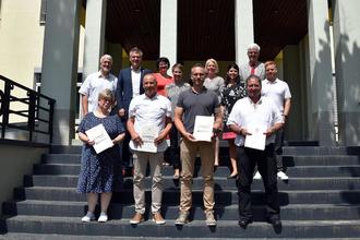 Hersfeld-Rotenburg, 21. Juli 2023 - Bei einer internen Feierstunde in der Kreisverwaltung haben Landrat Torsten Warnecke und Erster Kreisbeigeordneter Dirk Noll 14 Absolventinnen und Absolventen von Fort- und Weiterbildungen geehrt.