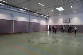 Die Turnhalle ist teilunterkellert und grenzt im Hallenbereich direkt an das Gemeindehaus. Durch eine mobile Zwischenwand können die Räumlichkeiten der Gemeinde sowie die Fläche der Turnhalle zusammengeschlossen werden und als größere Versammlungsstätte genutzt werden. Bei Veranstaltungen, wie beispielsweise Einschulungen oder Musikabenden, ist die Turnhalle für eine Besucheranzahl von 400 Personen ausgelegt.