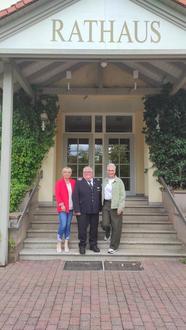 Von links: Hauptamtsleiterin Tanja Brand, ehemaliger Gemeindebrandinspektor sowie derzeitiger 1. Beigeordneter Thomas Schneemilch und Moderatorin Bärbel Schäfer