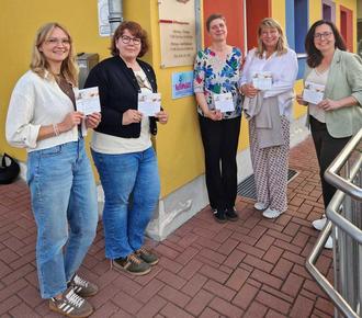 Von links nach rechts ist zu sehen Annalena Schüler (stellvertretende Krippenleitung), Nadja Franke (stellvertretende Kitaleitung), Susanne Lorenz und Renate Bechtel (FGKiKP vom Frühe Hilfen-Team) und Claudia Koch-Gruska (Netzwerkkoordination der Frühen Hilfen des Landkreises Hersfeld-Rotenburg)