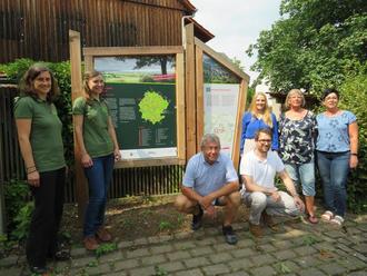 Die neue Informationstafel des Naturparks Knüll in Alheim-Oberellenbach (von l. n. r.: Katrin Anders (Geschäftsführerin Naturpark), Judith Walz (Mitarbeiterin Naturpark), Lutz Wildenhayn (Vorsitzender Heimatverein Ellenbach), Dr. Andreas Brethauer (Bürgermeister), Antonia Martens (Tourismus-Service Erlebnisregion Mittleres Fuldatal), Regina Zimmermann (Ortsvorsteherin) und Kerstin Wagner (stellv. Ortsvorsteherin) © Gemeinde
