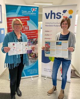Das Frauenbüro des Landkreises und die Volkshochschule lassen ihre gemeinsame Kooperation mit einer neuen Seminarreihe für Frauen wieder aufleben. Die Frauen- und Gleichstellungsbeauftragte des Landkreises Corinna Zehender (rechts) und Kathrin Böttcher von der Volkshochschule zeigen die Veranstaltungen im Programm des Frauenbüros und im Programm der VHS. Foto: Landkreis Hersfeld-Rotenburg