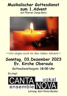 Das Vokalensemble Canta Nova gestaltet am 1. Adventsonntag, dem 03. Dezember 2023 in der evangelischen Kirche in Oberaula zusammen mit Pfarrer Jonas Betz einen musikalischen Gottesdienst unter dem Motto „Wir sagen euch an den lieben Advent.“