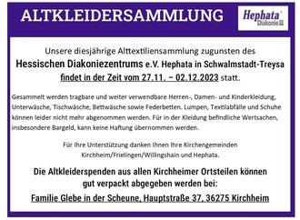 Unsere diesjährige Alttextiliensammlung zugunsten des Hessischen Diakoniezentrums e.V. Hephata in Schwalmstadt-Treysa findet in der Zeit vom 27.11. – 02.12.2023 statt. Gesammelt werden tragbare und weiter verwendbare Herren-, Damen- und Kinderkleidung, Unterwäsche, Tischwäsche, Bettwäsche sowie Federbetten. Lumpen, Textilabfälle und Schuhe können leider nicht mehr abgenommen werden. Für in der Kleidung befindliche Wertsachen, insbesondere Bargeld, kann keine Haftung übernommen werden. Für Ihre Unterstützung danken Ihnen Ihre Kirchengemeinden Kirchheim/Frielingen/Willingshain und Hephata. Die Altkleiderspenden aus allen Kirchheimer Ortsteilen können gut verpackt abgegeben werden bei: Familie Glebe in der Scheune, Hauptstraße 37, 36275 Kirchheim