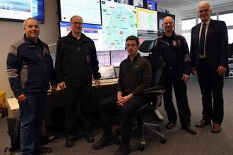 Sind sich einig, dass regionale Leitstellen erhalten werden müssen: Fachdienstleiter Gefahrenabwehr Thorsten Bloß, Kreisbrandinspektor Marco Kauffunger, Leitstellendisponent Florian König, Leiter der Zentralen Leitstelle Sebastian Landsberg und Landrat Torsten Warnecke (von links).