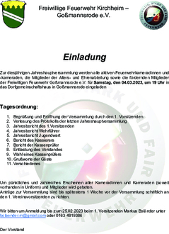 Zur diesjährigen Jahreshauptversammlung werden alle aktiven Feuerwehrkameradinnen und -kameraden, die Mitglieder der Alters- und Ehrenabteilung sowie die fördernden Mitglieder der Freiwilligen Feuerwehr Goßmannsrode e.V. für Samstag, den 04.03.2023, um 19 Uhr in das Dorfgemeinschaftshaus in Goßmannsrode eingeladen