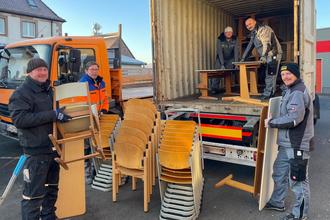 Gemeinsam mit Bauhofmitarbeitern des Kreises sowie Möbelspeditionsmitarbeitern wurden die Tische und Stühle jetzt in zwei Container geladen. Der Hilfstransport werde zunächst nach Polen geschickt und anschließend in die Ukraine weitergeleitet.