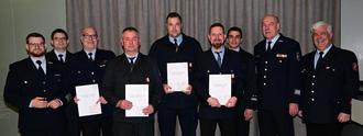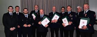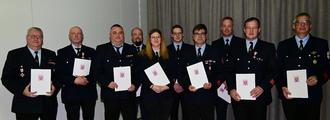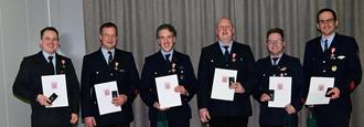 Das Brandschutzehrenzeichen in Gold für die 40-jährige aktive Mitgliedschaft wurde verliehen an: Wolfgang Schneider, Christoph Reichelt, Markus Grösch (4. - 6. von links) und Andreas Herber (3. von rechts). Martin Möller (1. von rechts) erhielt für 50-jährige aktive Mitgliedschaft das Brandschutzehrenzeichen Gold (Sonderstufe).