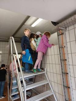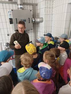 Am Dienstag stand das Element Wasser im Mittelpunkt. Die Kinder erfuhren zunächst anhand eines kurzen Films aus dem Schulfernsehen den Weg des Wassers vom Regentropfen bis zur Kläranlage und diskutierten darüber, wie wir Wasser im Alltag verwenden. Anschließend unternahmen sie eine kleine Wanderung zum Betriebsgebäude am „Hochbehälter Tannen“ des Zweckverbands Gruppenwasserwerk Florenberg, wo sie vom Wassermeister der Gemeinde Künzell Stephan Hahn erwartet wurden. Dort durften sie nicht nur einen Blick in das Innere der Wasserspeicherungs- und Aufbereitungsanlage mit dem riesigen Wasserbecken und seinem enormen Fassungsvermögen werfen, sondern lernten kindgerecht die verschiedenen Schritte der Wasseraufbereitung und weitere technische Details kennen. Den Entsäuerungsprozess verglich Herr Hahn alltagstauglich mit dem Pusten durch einen Strohhalm. Der Besuch war ein tolles Erlebnis, bei dem auch das Betreuerteam einiges Neues erfuhr.