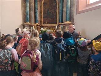 Am Mittwoch begaben sich die Kinder mit ihren Rucksäcken auf eine rund 3 km lange Wanderung durch Feld und Flur zum Florenberg. Dort wurden sie von Peter-Michael Auth vom Förderverein Florenberg 1998 e.V. empfangen. Dieser wusste viele interessante Geschichten über den Florenberg und die dortige Kirche zu erzählen. Besonders faszinierend waren die Erzählungen über die bunten Fenster im Altarraum der Florenbergkirche und die Rückkehr einer Statue aus dem 17. Jahrhundert, die nach einem Diebstahl aus der Kirche über 40 Jahre lang verschollen war. Die Kinder lauschten gespannt und antworteten lebhaft auf die Fragen von Herrn Auth.