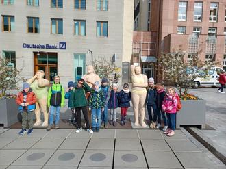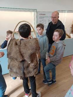 Am nächsten Tag ging es mit dem Stadtbus nach Fulda. Dort wurden die Kinder von einer Archäologin erwartet, die sie durch die Ötzi-Ausstellung im Vonderau Museum führte. Die Kinder hatten die Gelegenheit, eine Nachbildung des Ötzi in einem Schaukasten zu betrachten, während sie der spanndenden Erzählung über den Fund in den Bergen lauschten. Die Kinder erfuhren viel Wissenswertes über das Leben des Ötzi vor etwa 5300 Jahren, dessen Kleidung aus Bären- und Ziegenfell, sein Jagdverhalten und seine Lebensgewohnheiten. Den originalgetreu nachgebauten Rucksack aus Holz und Fell durfte jedes Kind einmal tragen. Nach der Führung gabe es noch Gelegenheit, die interaktiven Forscherstationen in der Naturkundeabteilung des Museums und die weiteren Ausstellungsbereiche zu entdecken. Auf dem Weg zum Stadtbus machten die Kinder Halt an der Eisdiele und zum Abschluss konnten sie sich auf dem Spielplatz am Harwald in Künzell nochmal richtig austoben.