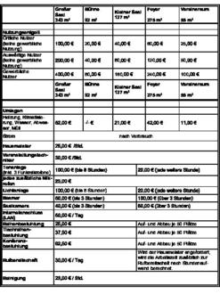| Zudem werden im Gemeindezentrum die Kosten des hauseigenen Ton- und Lichttechnikers, der Tonanlage inkl. Mikrofone, der Lichtanlage, des Beamers sowie für „Weiteres Material“ laut Preistabelle Nr. 1 von der Gemeinde übernommen. Bestuhlungs- und Reinigungsarbeiten sind selbst durchzuführen oder können gegen Zahlung der festgelegten Entgelte bei der Gemeinde bestellt werden. | |