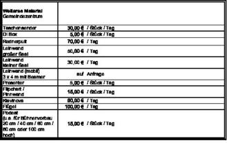 | Für Sonderausstattungen, wie z. B. Funkmikrofone oder Bühnenmonitore kann der Gemeindevorstand Sonderentgelte festlegen. | |