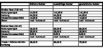 | 4) | Für politische Parteien und Wählergruppen, die im Kreistag oder im Hessischen Landtag vertreten sind, wird für Sitzungen oder Versammlungen ein Nutzungsentgelt für örtliche Nutzer zuzüglich Umlagen bzw. Stromkosten und ggf. weitere Serviceleistungen erhoben. |