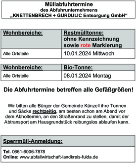 Wir bitten alle Bürger der Gemeinde Künzell ihre Tonnen
