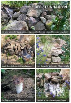 Wilde Ecken: Steinhaufen, Totholz-Hecken aus Reisig und Resten vom Strauchschnitt und Totholz-Haufen (morsches Holz) bilden kleine Nischen und wichtige Rückzugsmöglichkeiten für viele Lebewesen in unseren Gärten.
