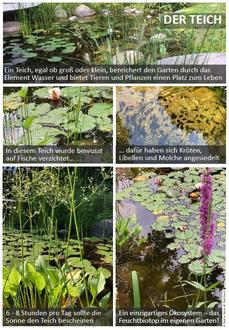 Feuchtbiotop oder Trockenbiotop: Ein Teich, egal ob groß oder klein, bereichert den Garten durch das Element Wasser und bietet so auch Tieren und Pflanzen, die ein feuchtes Milieu benötigen, einen Platz zum Leben.