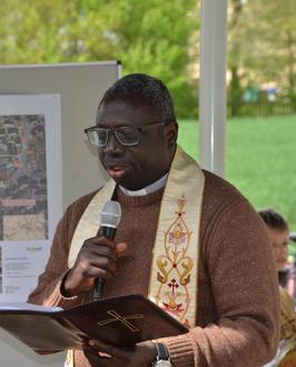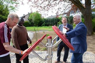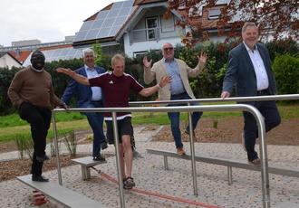Gaben dem Grezzbachpark den kirchlichen Segen. Von links: Pfarrer Dr. Innocent Oyibo und Pfarrer Wolfgang Echtermeyer mit Bürgermeister Timo Zentgraf, Künzell´s Bewegungscoach Bernd Jiptner und Festorganisatorin Sabine Räth im neuen Mehrgenerationen-Bewegungspark.
