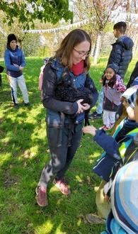 Wir hatten an diesem Tag aber noch weiteren Besuch von dem kleinen Lämmchen „Schnucki“. Unsere Kollegin Paulina Wiegand, die am Geisküppel eine Scheune mit Schafen und Hühnern bewirtschaftet, hat ein kleines Heidschnucken-Lämmchen in ihre Fürsorge genommen. Dieses wurde von der Mutter verstoßen und muss daher nun mit der Flasche aufgezogen werden. Es war natürlich schnell klar, dass Kinder und auch Erzieherinnen dieses kleine Lämmchen kennenlernen wollten. Reihum durfte jeder, der wollte, einmal über das kuschelweiche Fell streichen.