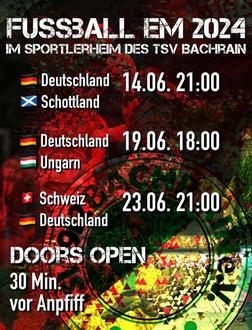 Bereits jetzt schon der Hinweis: Der TSV überträgt die Spiele der Deutschen Nationalmannschaft bei der EM live auf Großbildleinwand im Sportlerheim. Alle sind herzlich willkommen, die Spiele in interessanter Atmosphäre mit den heimischen Experten zu verfolgen.
