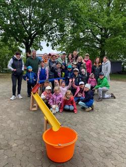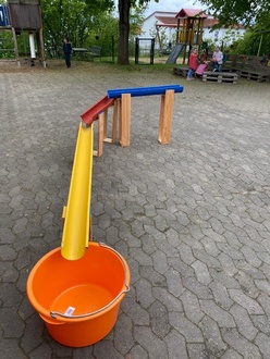 Am Freitag, 3.5.2024 kamen einige große und kleine Helfer auf dem Außengelände der Kindertagesstätte Schneckenhaus in Künzell-Bachrain zusammen, um gemeinsam kreativ zu werden. Das Ziel war der Bau einer Wasserbahn aus bunten Dachrinnen. Hierzu wurde fleißig gesägt, gepinselt und geschraubt. Die Dachrinnen-Bahn soll an heißen Sommertagen spielend leicht für eine willkommene Abkühlung der 60 Kinder sorgen. Finanziert wurden die Materialien durch die Einnahmen der im Herbst 2023 vom Elternbeirat organisierten St. Martinsveranstaltung.
