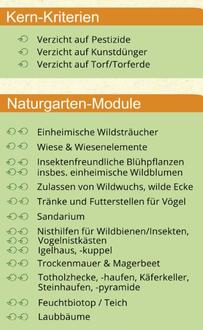 Die Kriterien (Kern-Kriterien und Naturgarten-Module) sehen Sie hier in der Übersicht. Eine Jury bewertet die erfüllten Kriterien bei Ihnen vor Ort. Bei erfolgreicher Umsetzung der Kriterien erhalten Sie die Auszeichnung „Lebendiger Garten“ und einen Sachpreis.