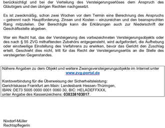 Wer ein Recht hat, das der Versteigerung des vorbezeichneten Versteigerungsobjekts oder des nach § 55 ZVG mithaftenden Zubehörs entgegensteht, wird aufgefordert, die Aufhebung oder einstweilige Einstellung des Verfahrens zu erwirken, bevor das Gericht den Zuschlag erteilt. Geschieht dies nicht, tritt für das Recht der Versteigerungserlös an die Stelle des versteigerten Gegenstandes.