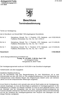 | lfd. Nr. 3: | Gemarkung Künzell Flur 2 Flurstück 3/79 Gebäude- und Freifläche, Rhönstraße 14a, 14b, 14c, 14d = 2700 m². | € 522.000,00; |