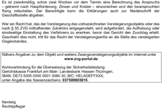 Wer ein Recht hat, das der Versteigerung des vorbezeichneten Versteigerungsobjekts oder des nach § 55 ZVG mithaftenden Zubehörs entgegensteht, wird aufgefordert, die Aufhebung oder einstweilige Einstellung des Verfahrens zu erwirken, bevor das Gericht den Zuschlag erteilt. Geschieht dies nicht, tritt für das Recht der Versteigerungserlös an die Stelle des versteigerten Gegenstandes.