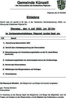 Hiermit lade ich gemäß § 82 Abs. 6 der Hessischen Gemeindeordnung (HGO) zur Sitzung des Ortsbeirates Pilgerzell für