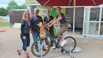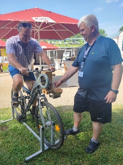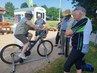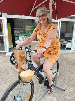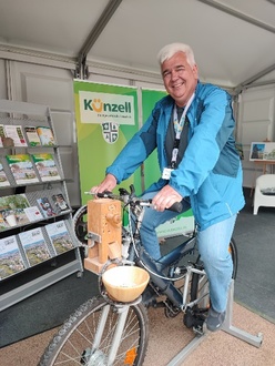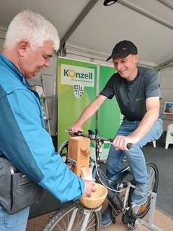 Auch die Angebote in der Mehrgenerationenarbeit waren inhaltlicher Schwerpunkt des Standes auf der Gartenschau. Highlight und Anziehungspunkt der Präsentation war ein sog. Müslifahrrad mit dem die Besucher sich ein leckeres Bio-Hafermüsli erradeln konnten. Die frischen Körner durften natürlich als Erinnerung mit nach Hause genommen werden. "Als Erinnerung an die sympathische Gemeinde und natürlich zum Verzehr" ergänzt Timo Zentgraf mit einem Augenzwinkern.