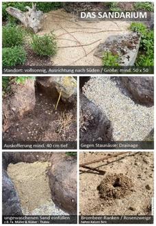 Das Sandarium: 60% unserer einheimischen Wildbienen nutzen Erdhöhlen für ihre Nachkommen. Ein einfacher Sandhaufen, der von Bewuchs freigehalten wird, dient solitären Wespen und anderen Insekten als Nistgelegenheit.