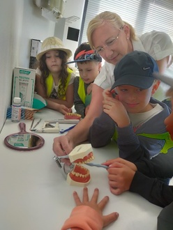Ein weiterer Ausflug führte die Kinder zu Zahnarzt Dr. Manfred Bock in der Turmstraße in Künzell-Bachrain. Schon seit Jahren gibt es eine enge Verbindung zwischen dem Zahnarzt und der Kita, zum Beispiel beim Zahnarzt-Café an dem Eltern Fragen zu Zahnputztechniken und Sprachentwicklung stellen können. Beim Besuch in der Praxis wurde allerhand ausprobiert und kennen gelernt. Ein spannender Ausflug, der den Kindern die Angst vor dem Zahnarzt nimmt und für die Wichtigkeit der Zahnpflege sensibilisiert.