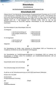 Der vorstehende Wirtschaftsplan (Haushaltssatzung) des Zweckverbandes Gruppenwasserwerk Florenberg für das Wirtschaftsjahr 2025 wird gemäß den Bestimmungen der Satzung des Zweckverbandes Gruppenwasserwerk Florenberg in der z. Zt. geltenden Fassung hiermit öffentlich bekannt gemacht.