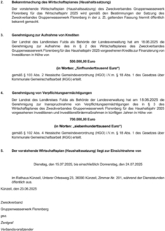 Der Landrat des Landkreises Fulda als Behörde der Landesverwaltung hat am 18.06.2025 die Genehmigung zur Aufnahme des in § 2 des Wirtschaftsplanes des Zweckverbandes Gruppenwasserwerk Florenberg für das Haushaltsjahr 2025 vorgesehenen Kredits zur Finanzierung von Investitionen in Höhe von