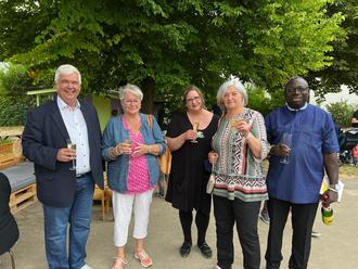Von links: Bürgermeister Timo Zentgraf, Marie-Luise Schmidt (war von 1972 über 40 Jahre Leiterin im Schneckenhaus), die freudige Gastgeberin Nadine Neidert-Nebel, Karin Hahn (war von 1972 über 45 Jahre stellvertretende Leiterin, ein Jahr kommissarische Leitung und stundenweise als Rentnerin eingesetzt), Pfarrer Dr. Innocent Oyibo (unterstützt das Team pädagogisch zu besonderen Anlässen wie Erntedank und an Weihnachten).