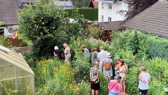 Bei den diesjährigen Gartenbesichtigungen (9 Termine) kamen rund 70 interessierte Bürger/innen um sich die naturnahen Gärten anzuschauen und zahlreiche Tipps und Informationen aus erster Hand zu erfahren. Auf dem Foto sieht man die zahlreichen Besucher im Garten von Ursula Weber in Engelhelms.