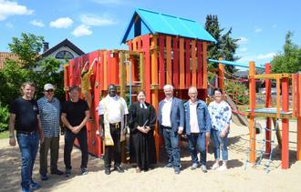 Bei der Segnung der neuen Spielgeräte durch Pfarrerin Julia Kaiser und Pfarrer Dr. Innocent Oyibo verglich Julia Kaiser in ihrer Ansprache das neue bunte Spielgerät mit einer Burg, die stark sei und Schutz biete. Bei einem gemeinsamen Gebet formten die anwesenden Gäste zugleich symbolisch ein Dach und zeigten ihre Stärke. Pfarrer Oyibo dankte für die Gemeinschaft, wünschte ein gutes Miteinander und segnete mit Weihwasser alle Geräte.