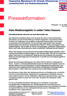 Weite Teile Hessens sind seit Wochen ohne größere Niederschläge geblieben. Nach unterdurchschnittlichen Niederschlägen in den Monaten März, Mai und Juni setzte sich dieser Trend auch im Juli bislang fort. Bedingt durch das Andauern der trockenen Witterung bei gleichzeitig hohen Temperaturen verschärft sich die Waldbrandgefahr in ganz Hessen.