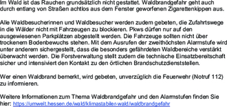 Weitere Informationen zum Thema Waldbrandgefahr und den Alarmstufen finden Sie hier: https://umwelt.hessen.de/wald/klimastabiler-wald/waldbrandgefahr