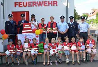 Das Gründungsfoto mit der Leiterin der Kinderfeuerwehr Anne Volknant (4. von links) und ihrer Stellvertreterin Sara Hooß (fünfte von links).