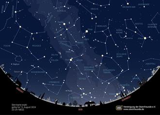 Auf der nachfolgenden Sternenkarte sehen Sie den Anblick des Sternenhimmels von 15.08.24, 23 Uhr.